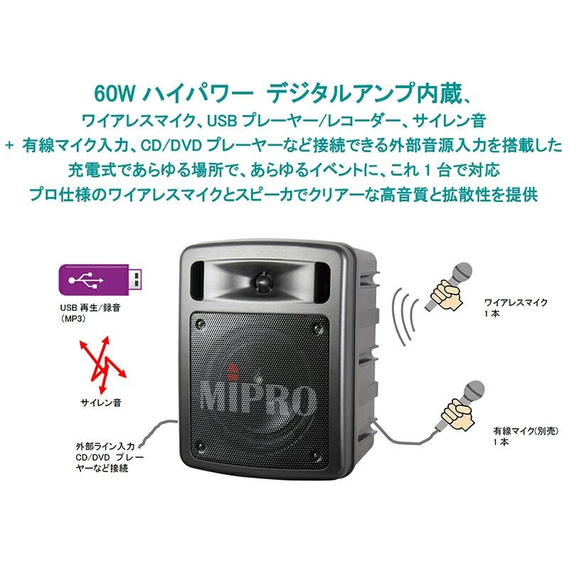 超軽量A4サイズながら60Wハイパワーの充電式ワイアレスアンプ MIPRO マイプロ 2.4GHzポータブルワイアレスPAシステム(1波:ハンドマイク)