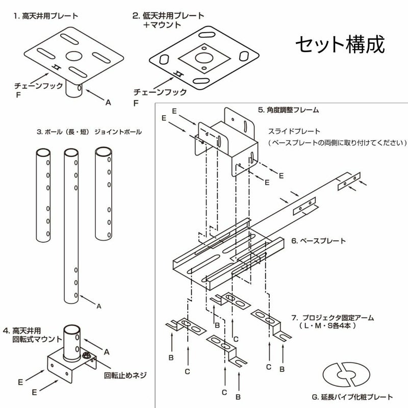 セット構成…長ポール・短ポール・延長ポール・ベースプレート・固定アーム・高天井用ブラケット・低天井用ブラケット・各種止めビス類