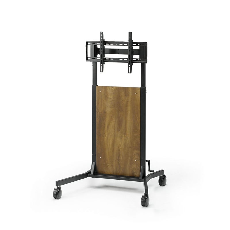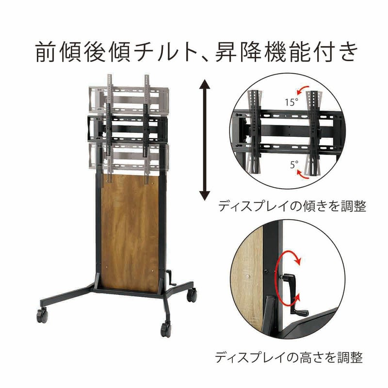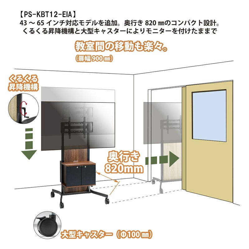 ハンドル式の昇降システムは、ディスプレイを設置したままでもラクラク昇降可能
