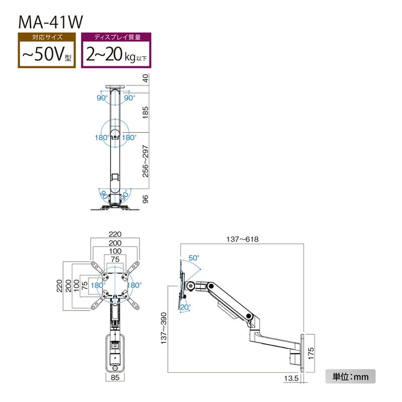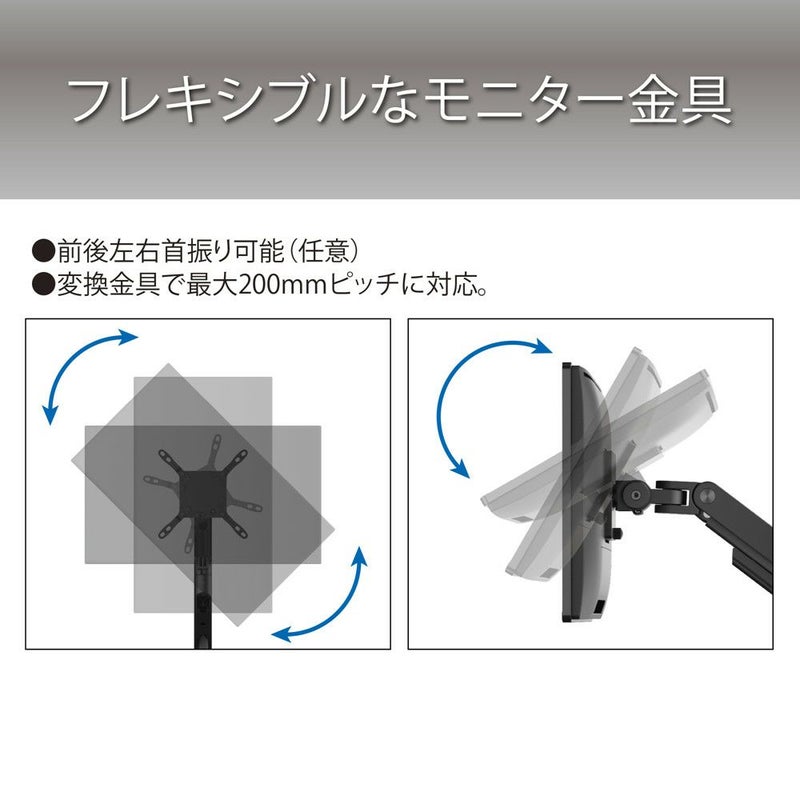 モニター角度調整、前方20度、後方50度、左右各180度(任意調節可能)タテ・ヨコ設置可能 左右各180度回転(タテ設置はモニターによる)※角度調節時、モニターが壁へ干渉する場合、確保できる角度は異なります。※2Kg未満のモニターは非対応