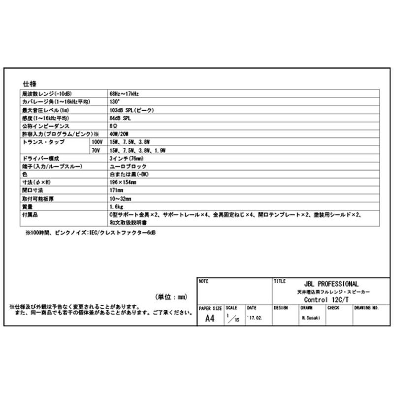 JBLサウンドを広範囲に届ける天埋めスピーカー(最小モデル) JBL ジェイビーエル Control 12C/T 天井埋込用フルレンジスピーカー/ラウドスピーカー 白 ペア