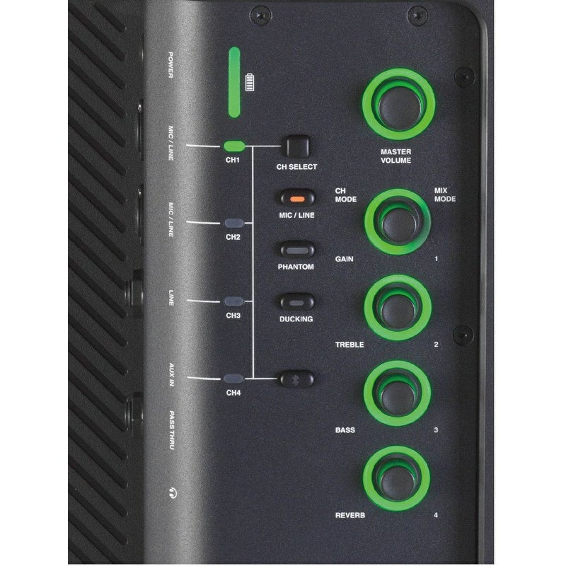 ■本格的な4chミキサーを内蔵。XLR/標準フォーン/ミニフォーンなど様々な入力端子を備えている上、信号レベルの切り替えやファンタム電源の供給、ハイインピーダンス入力も可能です。ダイナミックマイクやワイヤレスマイク、各種再生機はもちろん、コンデンサーマイクや楽器も直接入力できます。Bluetooth経由での入力にも対応しており、携帯端末の音楽ソースをワイヤレスで再生できます。専用アプリを使えば、1台の端末から最大4台のEON ONECompact-Y3 にBluetooth経由で信号を送ることも可能です。