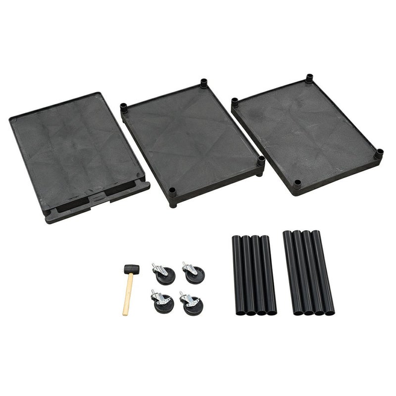 天板・中板・底板・ポール8本・ハンマー・キャスター・キャップが付属