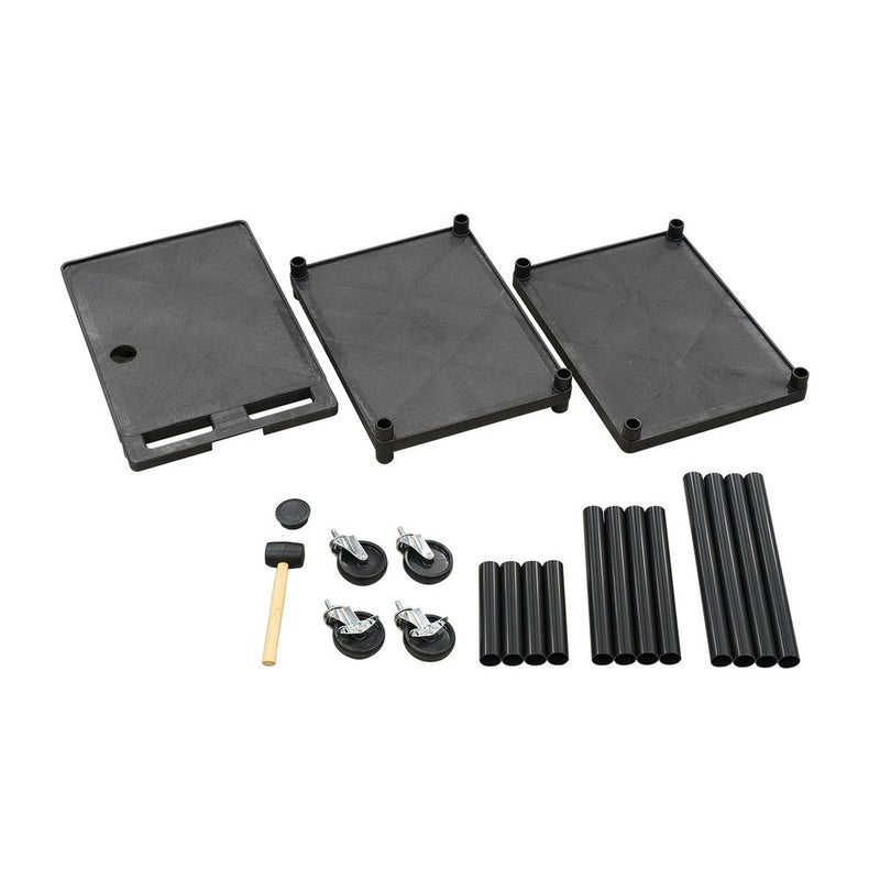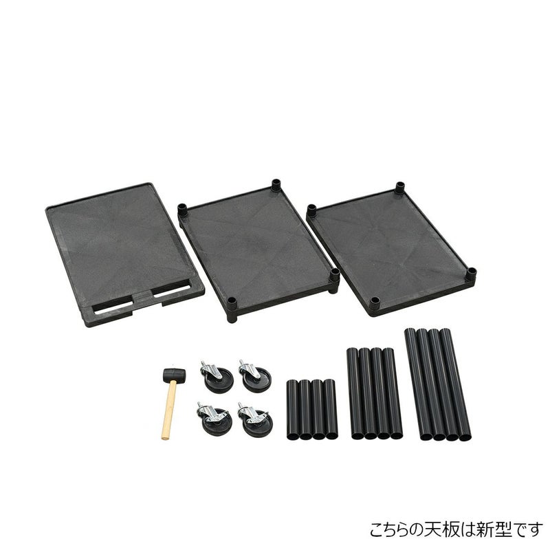 天板・中板・底板・ポール12本・ハンマー・キャスター・キャップが付属