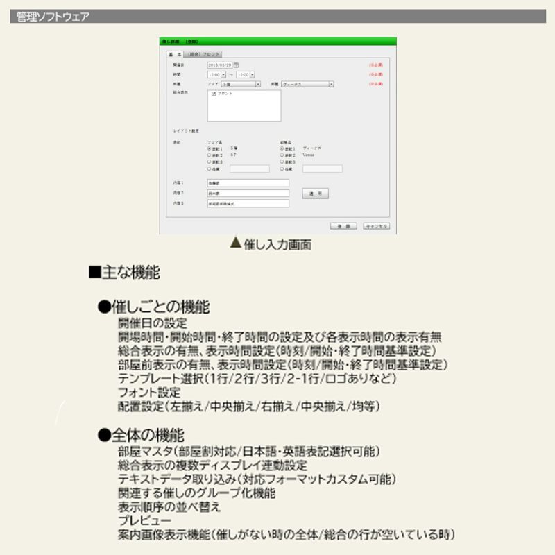 エントランスなどに設置する大型の総合表示と部屋前に設置する小型の行燈表示を一括管理して全自動で運転します。夕方の催しは午後になってから表示、午前中で終了する催しは15時に表示を終了、などのダイナミックな管理が可能です。