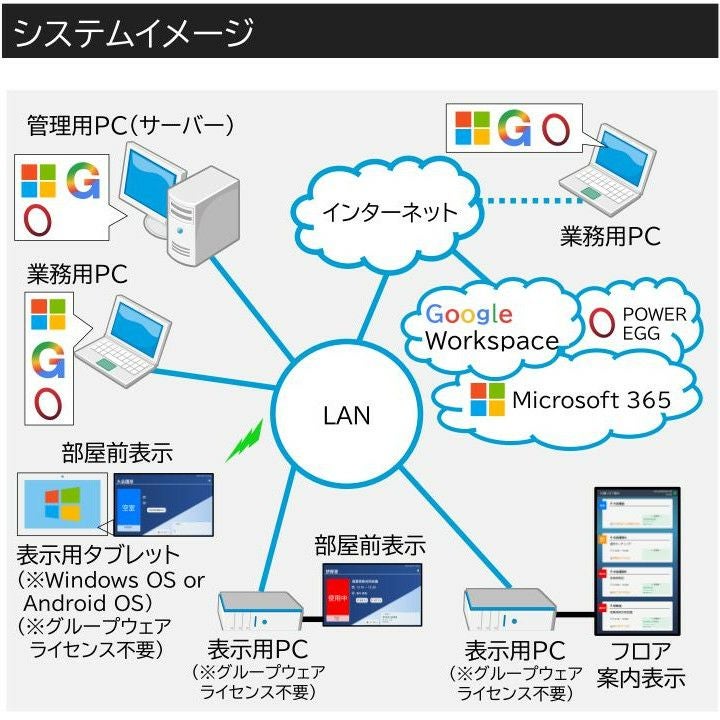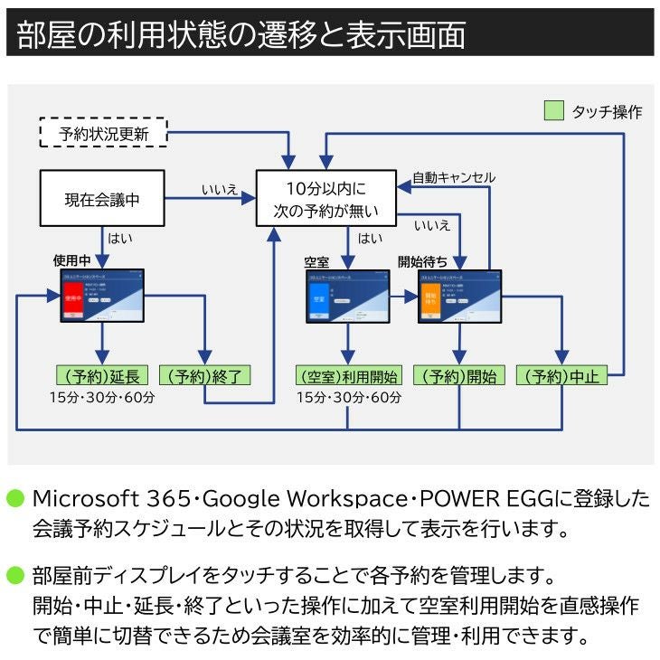 「Meet Sync Viewer」はグループウェア(Microsoft365・Google Workspace・POWER EGG)と連携して大型ディスプレイでは会議の一覧表示、部屋前ディスプレイでは会議内容の表示と会議の延長・終了等をタッチ操作で実現。